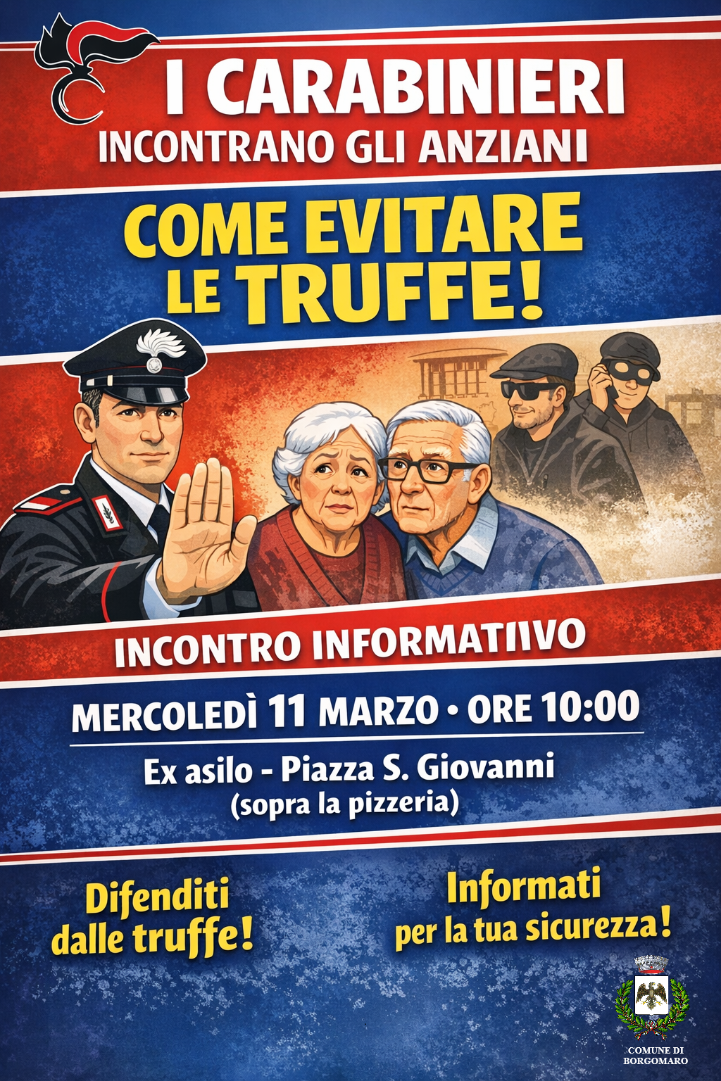 E' in programma un incontro informativo tenuto dai Carabinieri nella giornata di mercoledì 11 Marzo alle ore 10:00 presso l'Ex Asilo in Piazza San Giovanni (sopra la pizzeria) a Borgomaro, rivolto prioritariamente alla popolazione anziana.